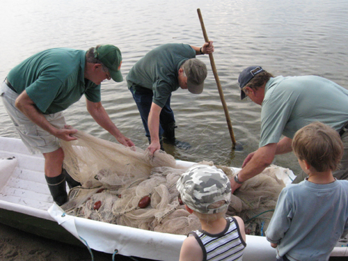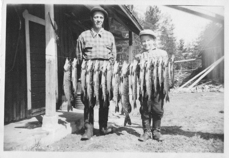 Kalastusmerkkejä myyvät Viuruniemessä Paavo Räsänen ja Tapio Malinen. Kalastuksen valvojana toimii Raimo Sahlman.